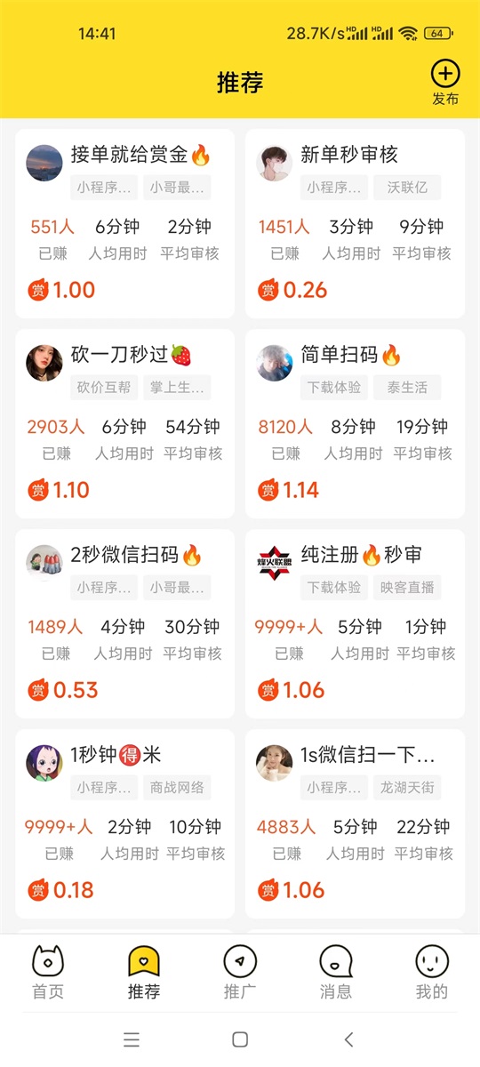 多类型赏金任务,软件下载、游戏试玩、小程序体验等,1元即可提现。
