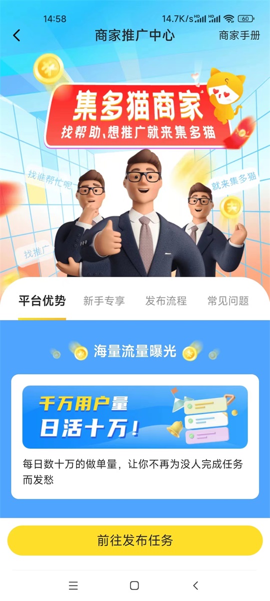 下载注册悬赏猫即可发布悬赏任务,锁定精准目标,百万用户替您服务。为您产品推广保驾护航,营销其实很简单